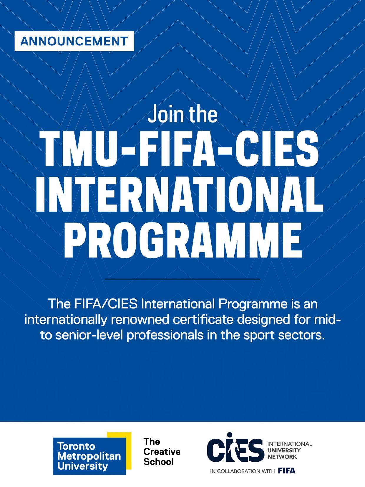 The Creative School at Toronto Metropolitan University (TMU) is proud to announce a groundbreaking global partnership with the CIES through the FIFA-CIES International University Network, officially launching the TMU-FIFA-CIES International Program.